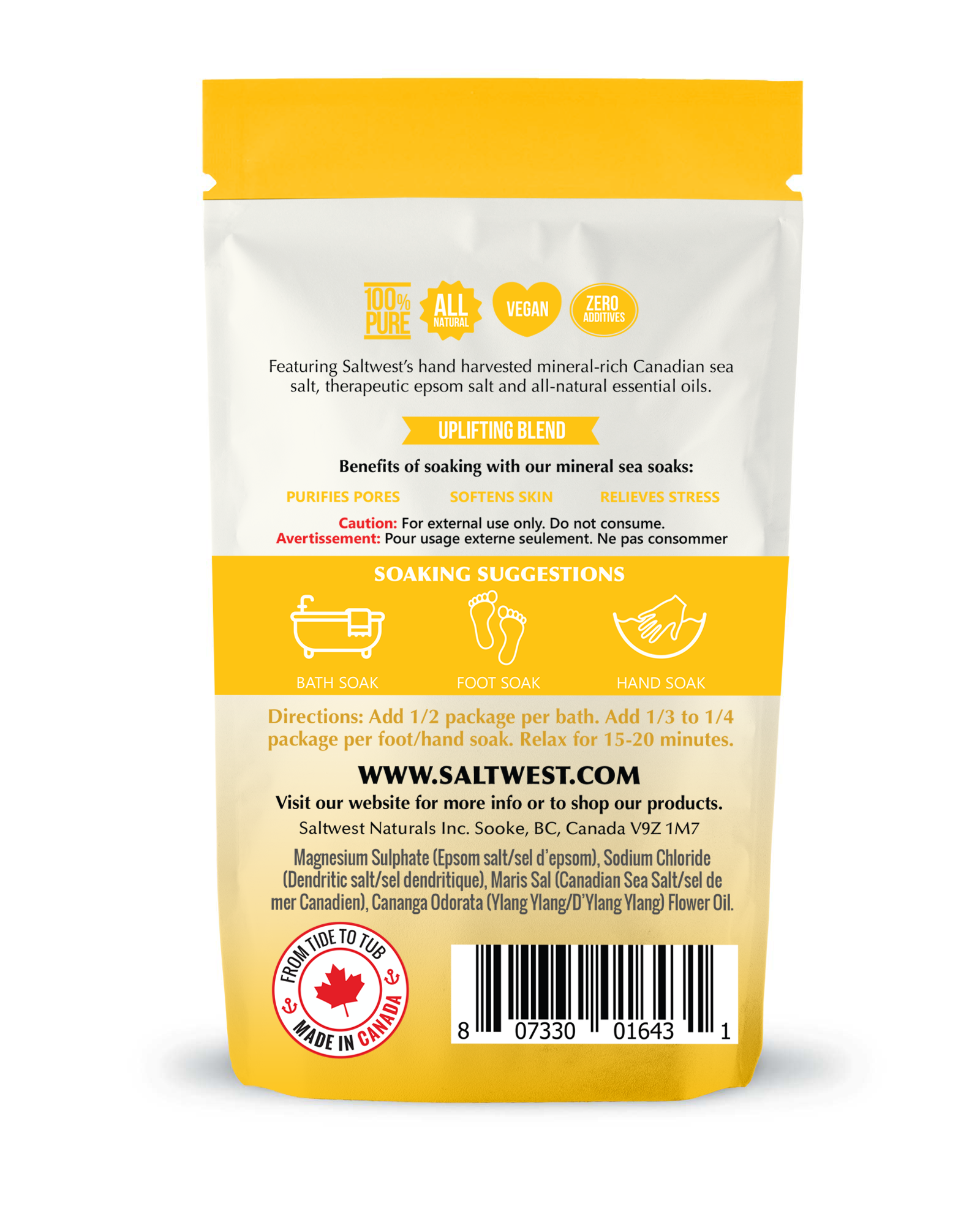 Handcrafted with pure sea salt harvested from the cold, pristine waters from the west coast of Vancouver Island, Canada. Blended with therapeutic Epsom salt and natural essential oils for a relaxing soaking experience.
