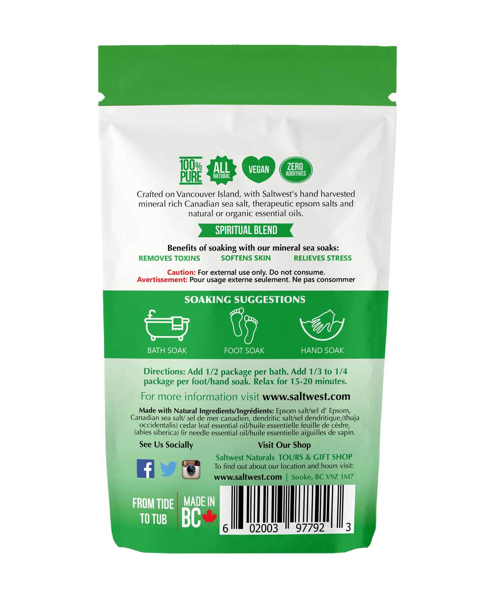 Spiritual Blend Enjoy the benefits of a natural mineral soak crafted with pure sea salt, harvested from Vancouver Island’s pristine North Pacific, and a premium blend of epsom salt. Bring a sense of sacredness to life with our Tree Hugger blend. Allow the fresh scent of aromatic Fir needles and Cedar leaves from the west coast rainforest connect you to the nurturing aspects of nature and help strengthen your spirit.