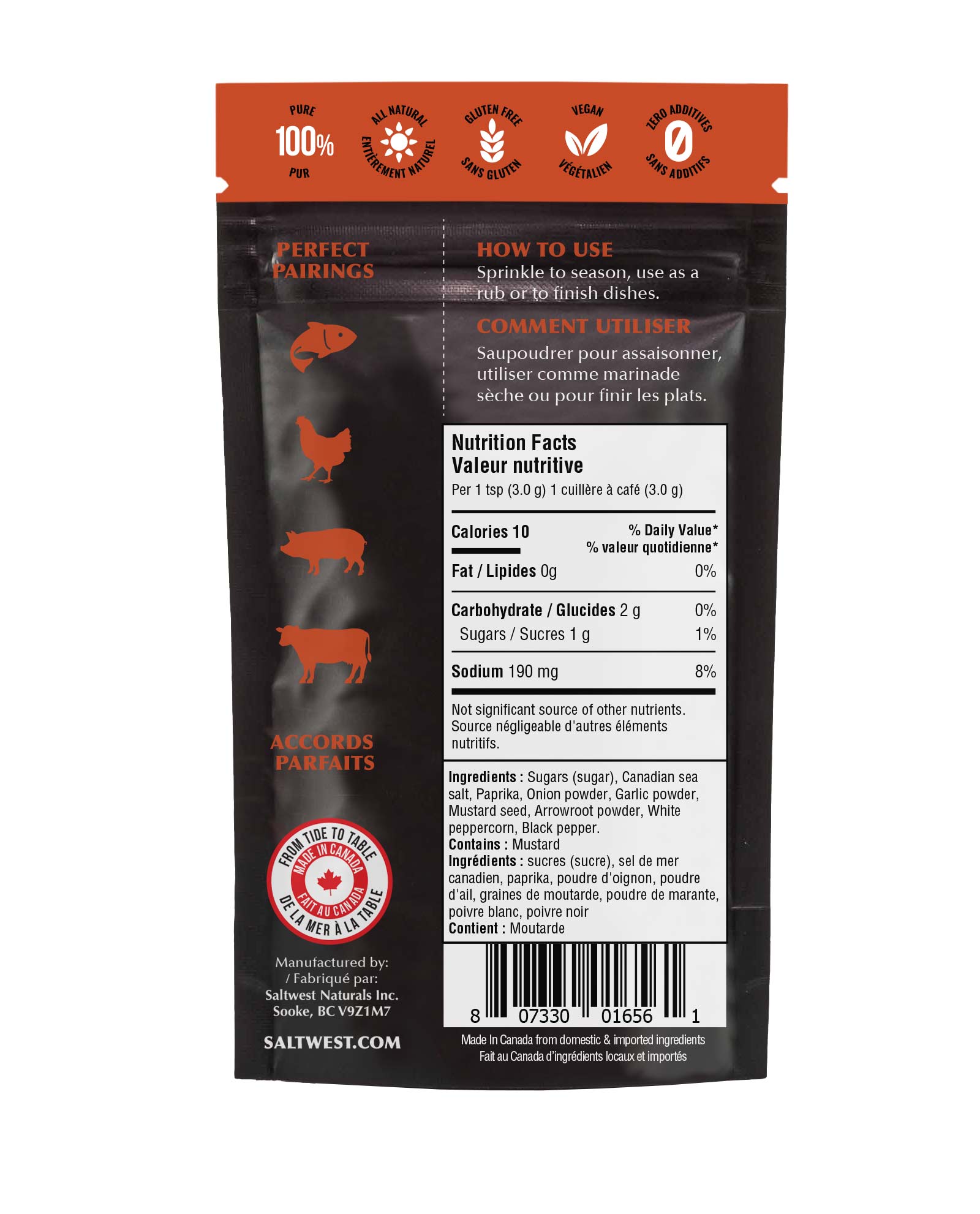 Sugars (sugar), Paprika, Canadian Sea Salt, Onion Powder, Garlic Powder, Mustard Seed, Arrowroot Powder, White peppercorn, Black peppercorn. CONTAINS : MUSTARD
