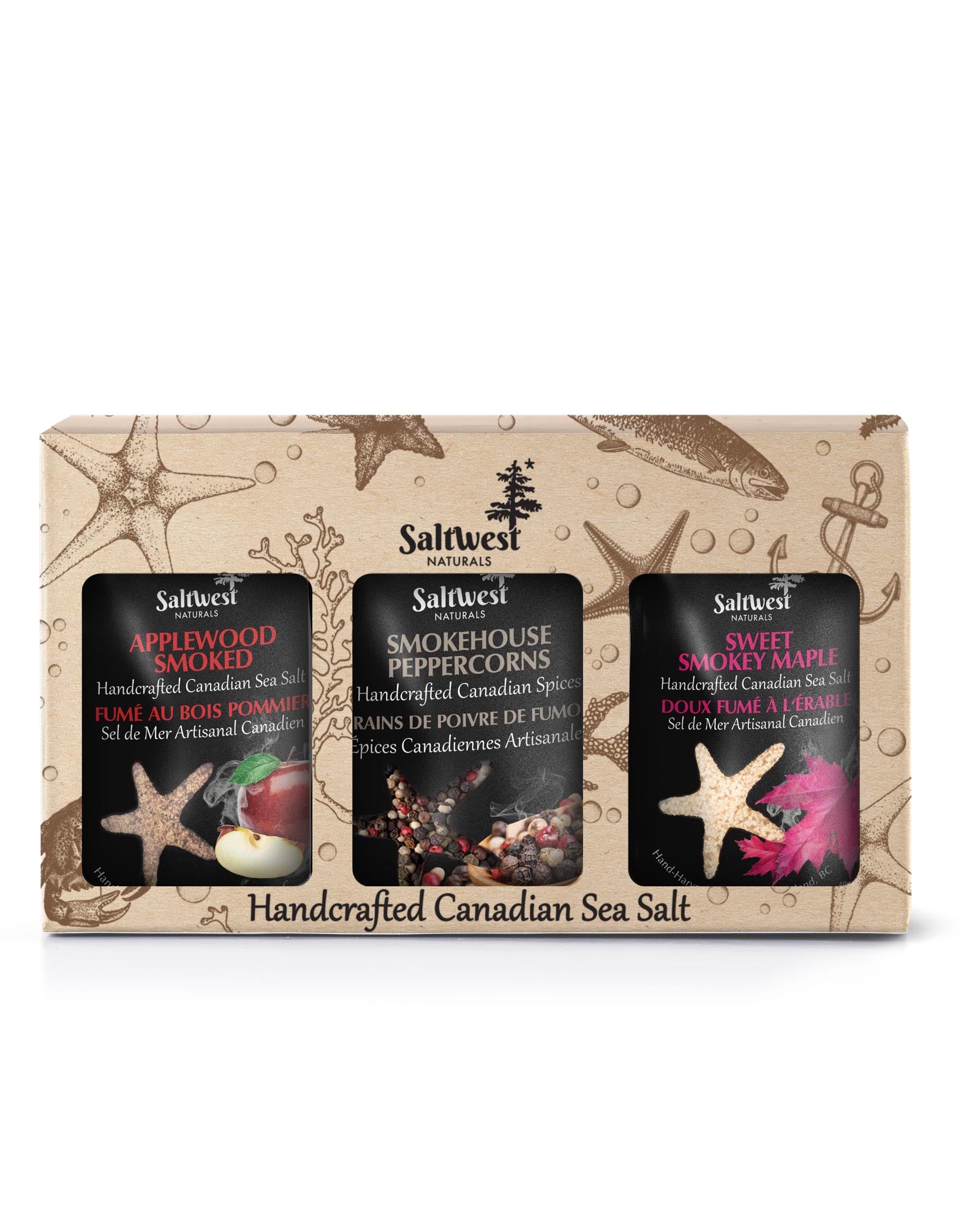 Our West Coast inspired Culinary Gift Box is a great gift for that special someone in your life. Smoked Salt & Pepper Set includes our Organic Sweet Smokey Maple 40g, Smoked Peppercorns 45g & Applewood Smoked Sea Salt 45g.