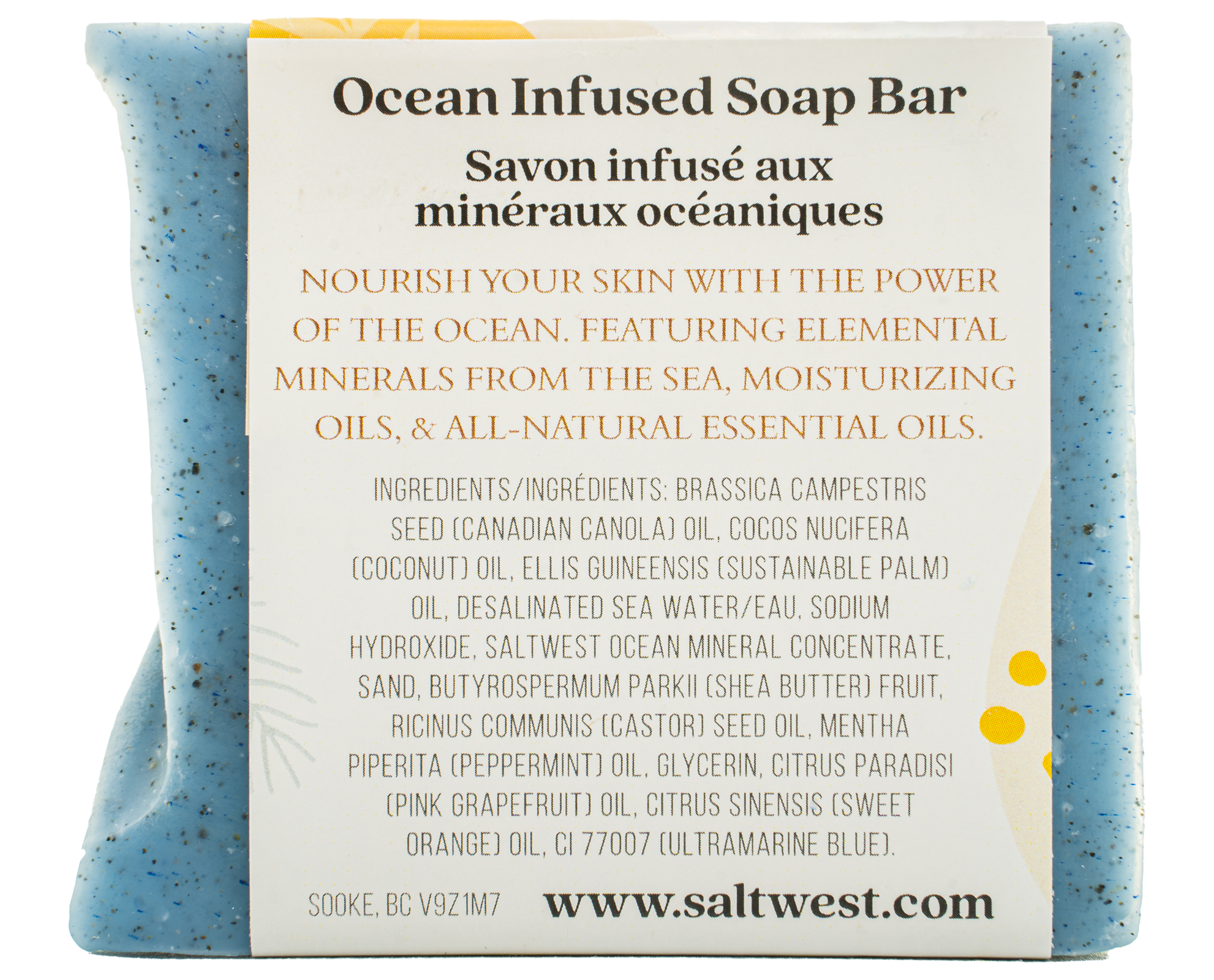 Brassica Camperstris Seed (Canadian Canola) Oil, Cocos Nucifera (Coconut) Oil, Ellis Guineensis (Palm) Oil, Desalinated Sea Water/Eau de Mer, Sodium Hydroxide, Saltwest Ocean Mineral Concentrate, Butyrospermum Parkii (Shea Butter) Fruit, Ricinus Communis (Castor) Seed Oil, Mentha Piperita (Peppermint) Oil, Glycerin, Citrus Paradisi (Pink Grapefruit) Oil, Citrus Sinensis (Sweet Orange) Oil, CI77007 (Ultramarine Blue).