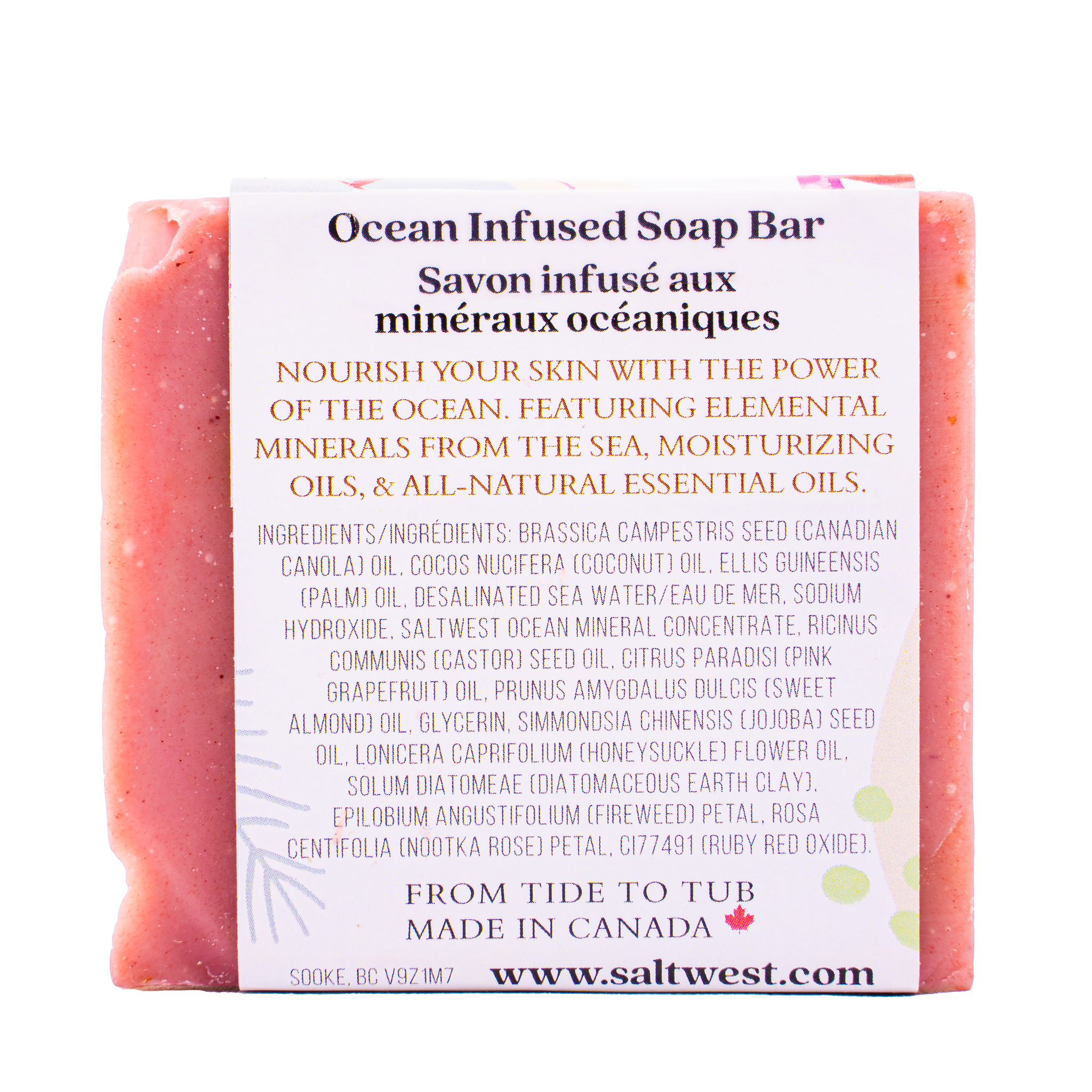 Wildflowers features local Fireweed & Nootka Rose petals harvested from the coastal forests of Vancouver Island. A beautiful scent is created with Honeysuckle & Pink Grapefruit Essential Oils, while Diatomaceous Earth powder helps to remove unwanted dead skin cells.