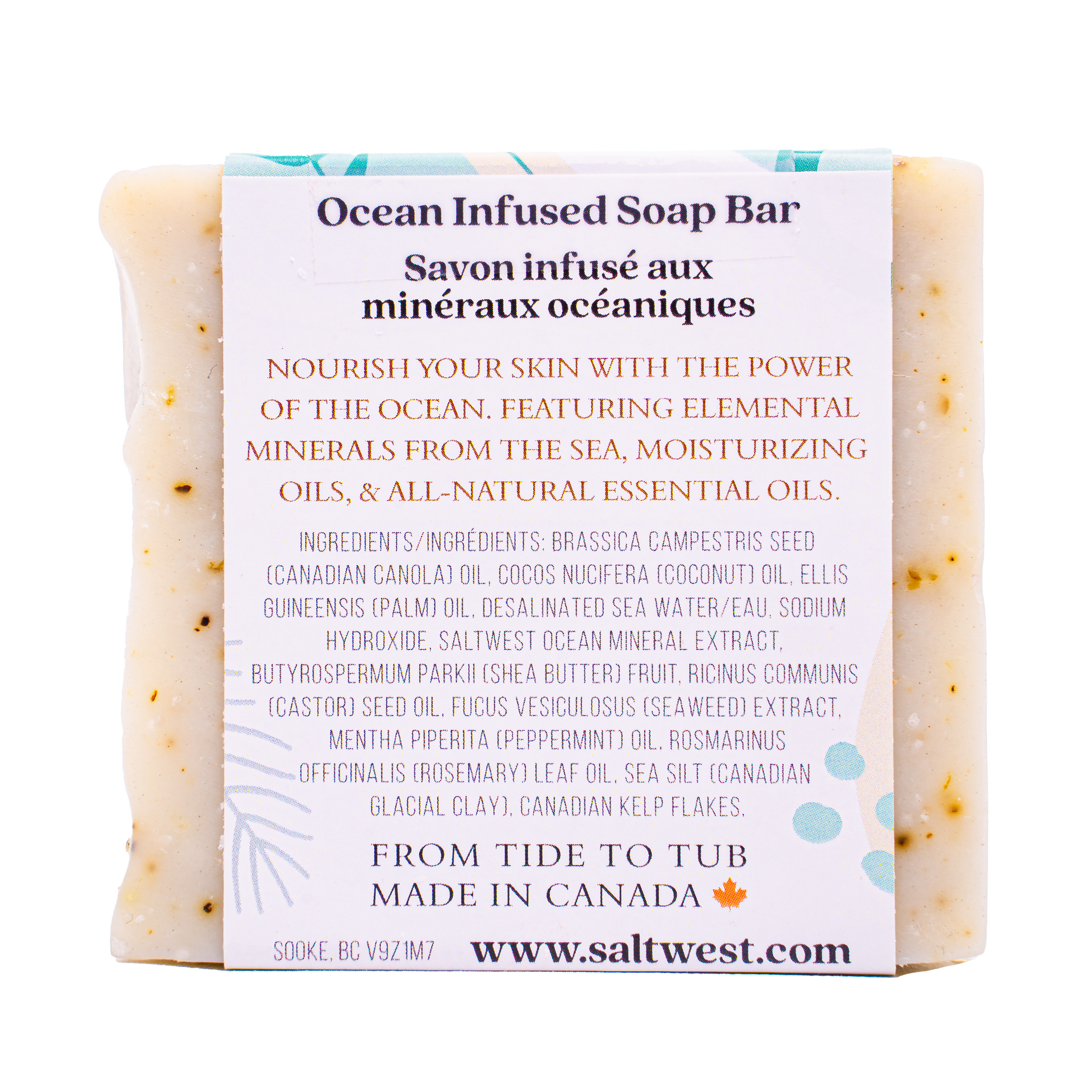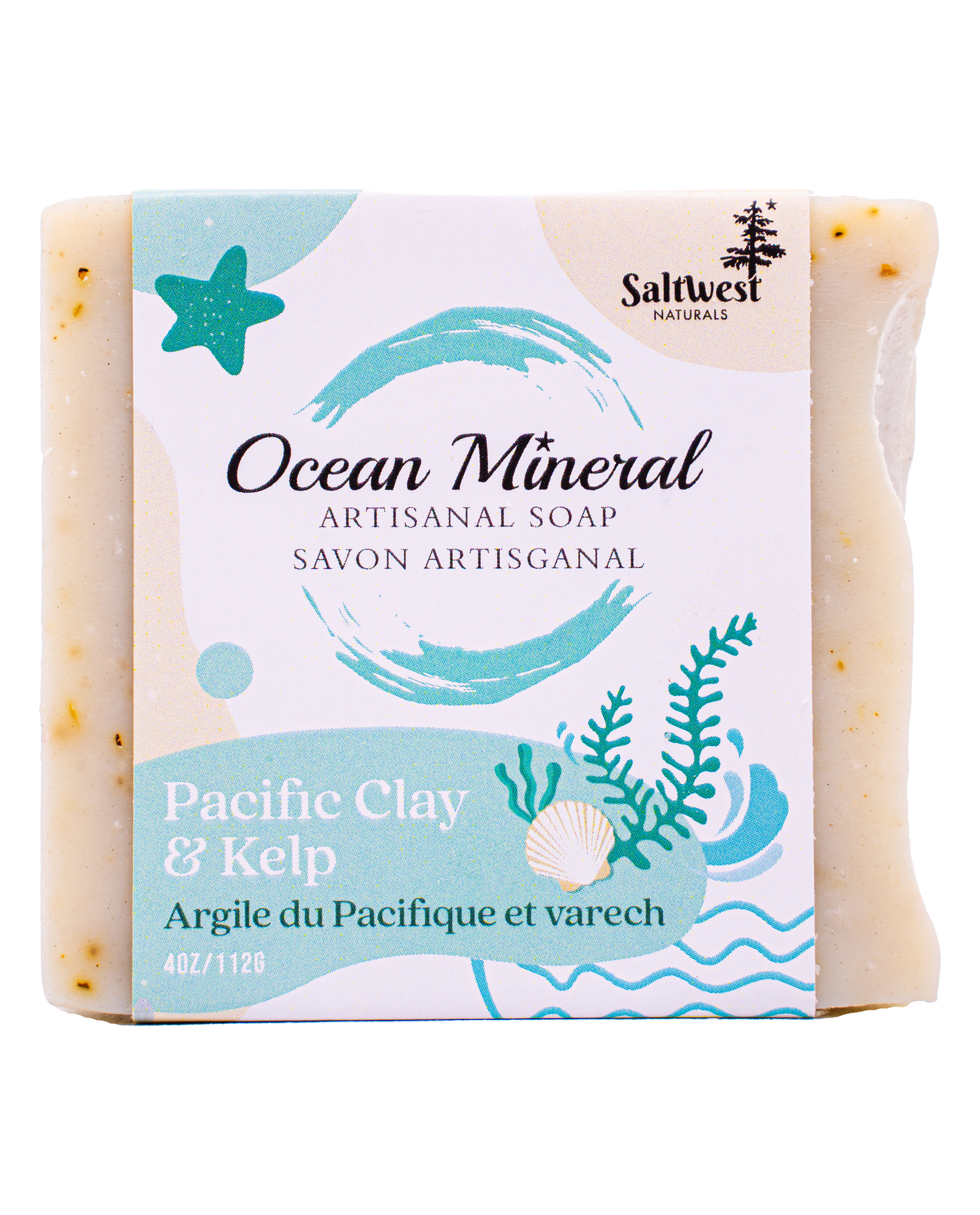 From the bountiful shores of beautiful British Columbia this bar is packed with a blend of 7 different Canadian Kelps. Featuring Pacific Glacial oceanic clay which helps draw oils and impurities from your skin. With its high salt and ocean mineral content it will provide necessary nutrients that are essential to healthy skin. Scented with refreshing Peppermint and Rosemary essential oils for a cooling effect on the skin.
